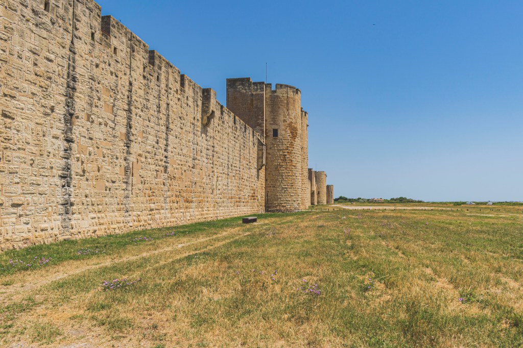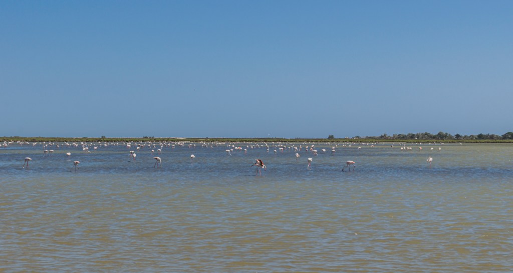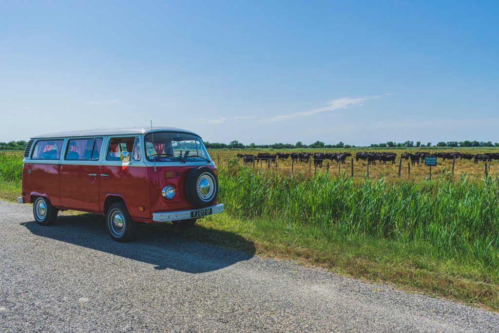 Nous reprenons notre périple et allons manger à l’ombre des remparts d’Aigues-Mortes. Nous flânons un peu. Doudou m’offre de superbes boucles d’oreilles dans chez Marie Bijoux qui liquide sa boutique. Nous allons ensuite voir la ville de Saintes-Maries-de-la-mer (très jolie ces maisons blanches), et nous nous baladons en Combi dans la Camargue. Nous en prenons plein les yeux entre les flamants roses et les taureaux. Avec Chianti, qui est rouge, nous ne restons pas trop longtemps, on sent que les taureaux vont nous attaquer!