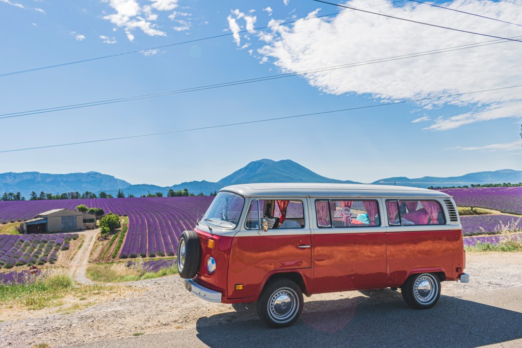 Le midi, nous déjeunons dans les lavandes. Quelle vue, c’est agréable !