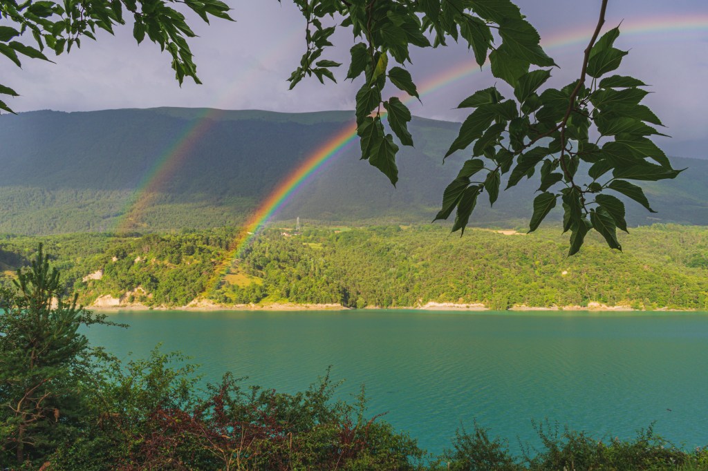 Pourtant aujourd’hui il ne fait pas chaud. On le laisse respirer le temps d’acheter a manger pour ce soir. Ça ne va pas beaucoup mieux mais on arrive tant bien que mal au camping 3* Herbelon. Doudou ne se laisse pas faire. Nous nous posons avec vue sur le lac sous la pluie. Il y a un magnifique arc en ciel top pour les photos.
