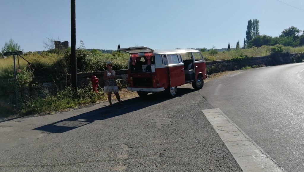 Nous partons direction les gorges du Verdon. 30 minutes avant d’arriver, Chianti se coupe en pleine montée, il redémarre, se recoupe… Ainsi de suite tous les 2 mètres. Les 30 prochaines minutes vont être longues. On s’arrête pour le laisser respirer un peu (il fait très chaud aujourd’hui). 5 minutes après (2 minutes en vrai) rebelote. Évidemment, à cette heure-ci (18h30) les garages commencent à fermer.